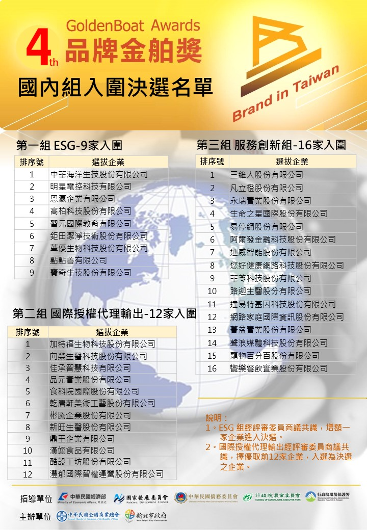 The finalists of the Fourth Golden Boat Awards will be announced on July 22. Nine enterprises have been listed in the ESG division, namely Hi-Q Marine Biotech International, Startek, Taiwan Dive, T-Global Technology, Play School, Ju Tian Cleantech, Q-Yo Bio-Technology, Agoood, and Biokey Bio-Technology. Everyone is welcome to cheer to the above companies!